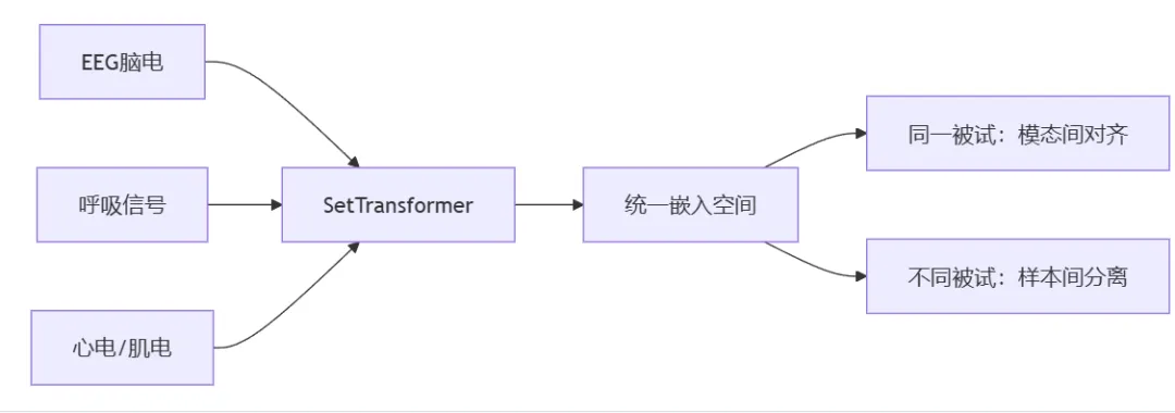 💡 核心思想:无需人工标注,通过跨模态一致性(同一被试的EEG/呼吸/心电信号应具有相似表征)和跨被试差异性(不同被试的睡眠模式应可区分)学习病理敏感的通用表征。
