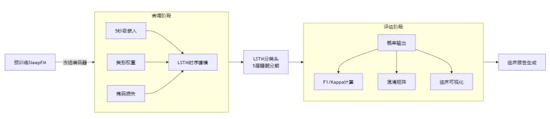 💡 设计哲学:冻结预训练编码器(保留通用睡眠表征能力)+ 微调轻量分类头(适配具体临床任务),实现小样本高效迁移(仅需100例标注数据)。