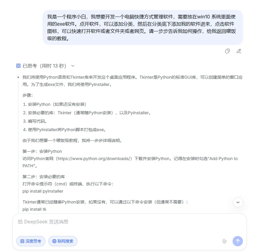 抱着试试看的心态,我把想要的功能一字不差地发给了 DeepSeek,还特意嘱咐它:“我是纯纯的编程小白,想做个能在 Win10 上用的 exe 格式快捷方式管理软件,要喂饭级的教程,一步一步告诉我咋操作。”