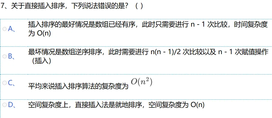 选项 C:插入排序是稳定的排序算法,这个说法是正确的。因为它是将元素插入到前面已排序的合适位置,不会打乱相同值元素的顺序。