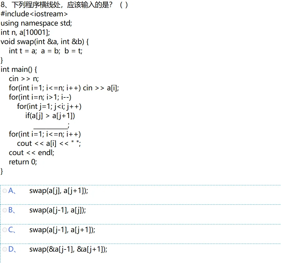 • 因此,当满足 if(a[j] > a[j+1]) 的条件时,需要执行的语句是 swap(a[j], a[j+1]);,对应选项 A。