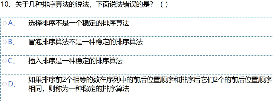 选项 B:冒泡排序是稳定的排序算法,它只会交换相邻且逆序的元素,不会改变相同值元素的相对位置,所以该选项说法错误。
