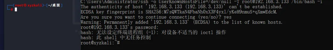 ```bashssh -o UserKnownHostsFile=/dev/null -T root@192.168.3.133 /bin/bash -i#不记录ssh公钥在本地.ssh目录中-o UserKnownHostsFile=/dev/null:这个选项用于指定SSH客户端用来存储已知主机密钥的文件。在这个命令中,它被设置为 /dev/null,这是一个特殊的设备文件,写入到它的数据都会被丢弃。```