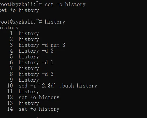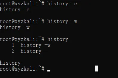```bash# 清除当前shell缓存命令记录,当前session之后的命令不会再记录,不会删除history⽂件中的记录。unset HISTORY HISTFILE HISTSAVE HISTZONE HISTLOG```