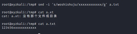 ```bashsed -i 's/要被取代的字符串/新的字符串/g' 目标文件sed -i 's/woshishuju/xxxxxxxxxxxx/g' a.txt```