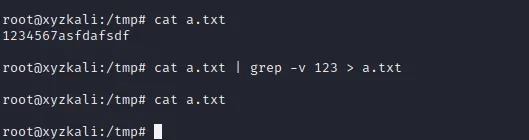 ```bash# 1、将目标文件中带有关键字字样的记录删除,并保存为一个文件#读取目标文件 → 过滤掉含关键字的行 → 把剩下的内容写入新文件cat 目标文件| grep -v 关键字(带有关键字的记录删除) > 篡改后文件cat a.txt | grep -v 123 > a.txt# 2、将伪造文件覆盖到目标文件上cat 篡改后文件 > 目标文件```