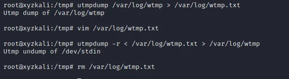 ```bashutmpdump /var/log/wtmp > /var/log/wtmp.txtvim /var/log/wtmp.txtutmpdump -r < /var/log/wtmp.txt > /var/log/wtmprm /var/log/wtmp.txt```