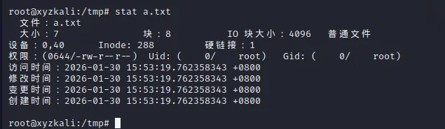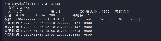 ```bashstat test.txt#这个命令会显示三个时间,一个最近访问时间一个最近修改时间一个最近改动时间访问时间用a参数可以改,修改时间用m参数可以改,改动时间不可以改,因为改动时间是系统自动更新的,包含了元数据的改动。```