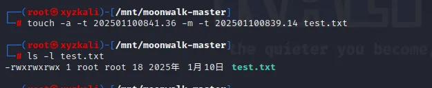 ```bashtouch -a -d "2023-02-02 11:10:20.000235123" a.txttouch -m -d "2023-02-02 12:10:20.010242137" a.txt-d 参数指定你要修改的时间,点后面是时间戳,随意输入就可以,不要为一串零,容易引起怀疑。```