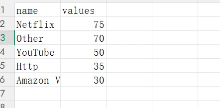 import matplotlib.pyplot as pltimport numpy as npimport pandas as pd# 1. 准备数据try: file_path = 'data.xlsx' # 修改点A: 去掉 index_col=0 (因为生成文件时 index=False) df_raw = pd.read_excel(file_path, engine='openpyxl', sheet_name='Sheet1', header=0) data = dict(zip(df_raw['name'], df_raw['values'])) print("成功读取数据:") print(data)except Exception as e: print(f"文件读取错误或文件不存在: {e}") data = { 'Netflix': 75, 'Other': 70, 'YouTube': 50, 'Http': 35, 'Amazon Video': 30}