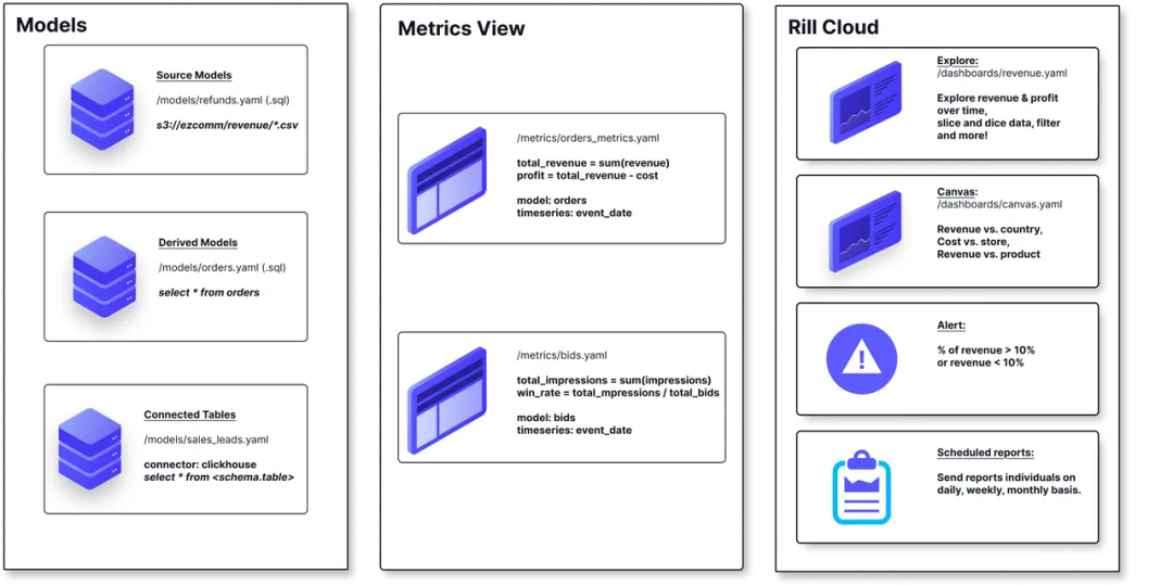 虽然 Rill 更像是一个工具而非传统的 Python 库,但它在现代 Python 数据栈中地位独特。Rill 基于 DuckDB,能够快速读取本地数据(CSV, Parquet),并瞬间生成交互式的 BI 仪表盘。它解决了“为了看个图表还要搭一套 Superset”的痛点,非常适合快速探索数据分布。
