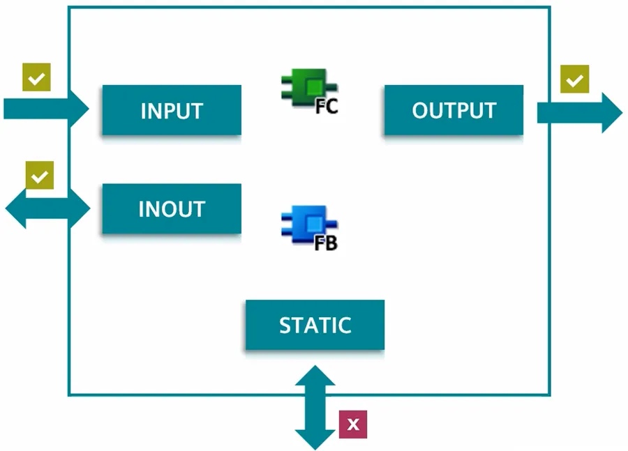 FB 块的静态变量仅限块内部使用,不得在块外访问背景数据块中的静态变量,且静态变量不允许访问外部全局变量。