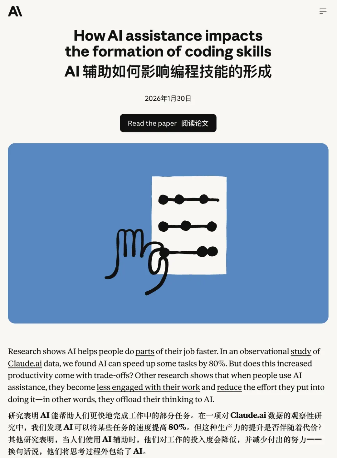 这份研究的主题为“How AI assistance impacts the formation of coding skills”,旨在深入评估 AI 编程工具(例如 Claude)对开发者技能形成的影响。研究利用随机对照试验,对比了使用 AI 与手动编码两类开发者在学习新技术时的表现差异。