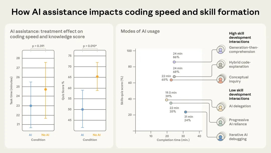 AI 互动方式影响学习成果。与单纯让 AI 写代码相比,那些在生成后请求解释、主动提问概念的开发者成绩更高,说明“与 AI 合作的方式”决定了是否能真正学习。