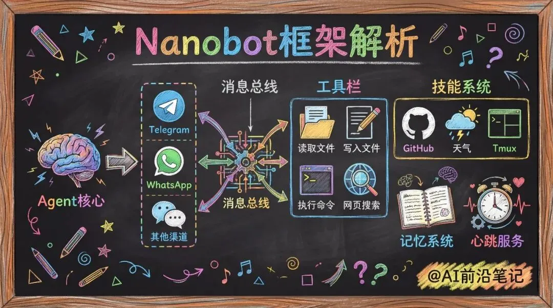 nanobot用约4000行代码实现了一个五脏俱全的AI助手框架,它的设计体现了几个值得学习的工程原则: