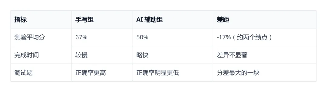 Anthropic 这份实验的结论很明确:在学新技能的时候,用 AI 辅助写代码,会明显拉低后面测验的表现,平均约 17%,调试题上尤其明显;完成时间上反而没拉开差距。