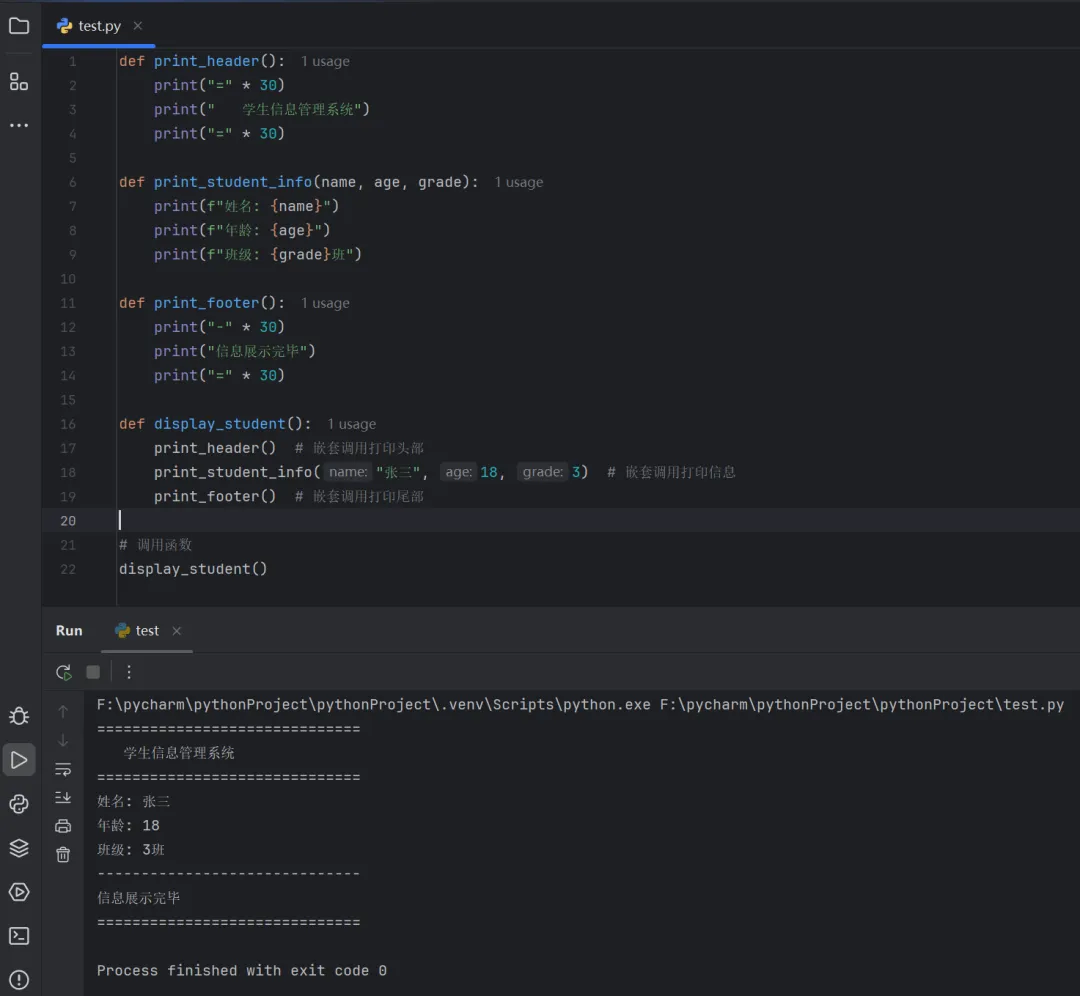 4、display_student():作为主函数,调用以上三个函数,依次打印标题、学生信息(假设学生为“张三”,18岁,3班)和结束信息。