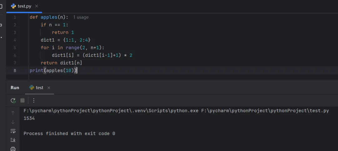 def apples(n): if n == 1: return1 dict1 = {1:1, 2:4} for i in range(2, n+1): dict1[i] = (dict1[i-1]+1) * 2 return dict1[n]print(apples(10))