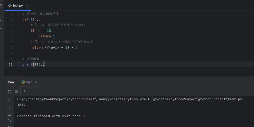 # 第一步:确定函数功能def f(n): # 第二步:编写递归结束条件(出口) if n == 10: return1 # 第三步:寻找与这个问题相似的等价公式 return (f(n+1) + 1) * 2# 调用函数print(f(1))