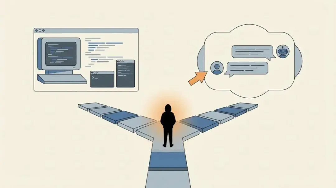 Alt text: 程序员站在岔路口,面对传统代码编辑器和AI助手界面的选择,体现AI时代的分水岭时刻2024年的最后一天,Redis之父Antirez在博客里写下一句话——