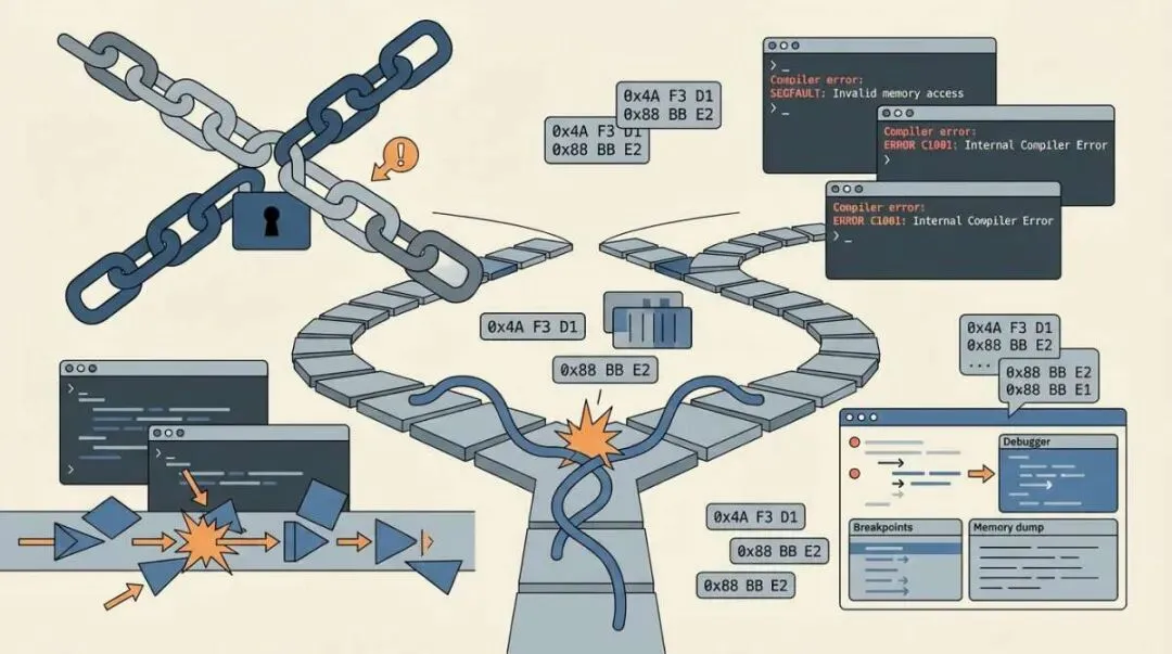 Alt text: 系统编程的高摩擦战场,展示TCP死锁、编译器错误、调试器等复杂技术元素的抽象可视化过去我们把程序员想象成工匠:掌握语法、工具和库,然后把需求翻译成代码。