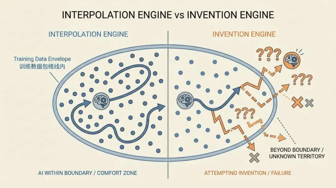 Alt text: 插值引擎vs发明引擎对比图,左侧展示AI在训练数据包络线内的强大能力,右侧展示在需要创新时的局限如果你只看效率,你会觉得世界变好了:活更快了,学习成本更低了,原本懒得做的小工具也变得可行。