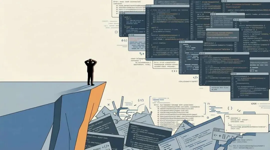 Alt text: 调试悬崖概念图,程序员站在悬崖边面对难以理解的代码和错误信息,体现失去智力控制权的危机Antirez的判断可以用两个角色概括:
