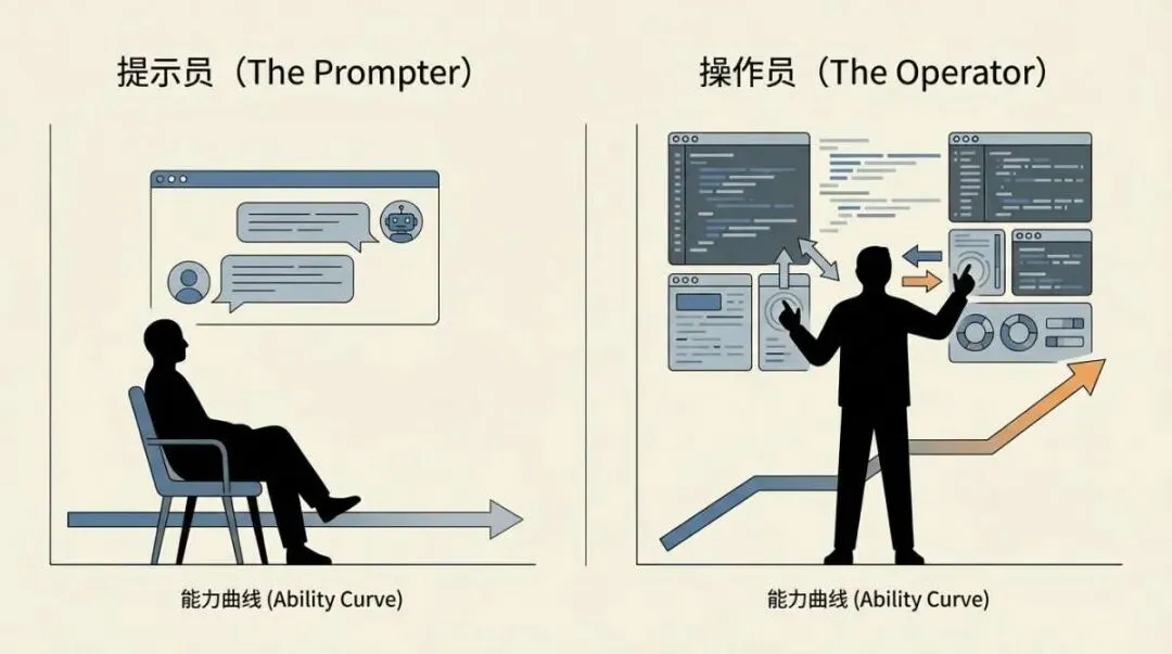 Alt text: 提示员vs操作员对比图,左侧是能力曲线平缓的被动提示员,右侧是能力持续上升的主动操作员方法一:拒绝"一句流",把隐性约束写成显性契约