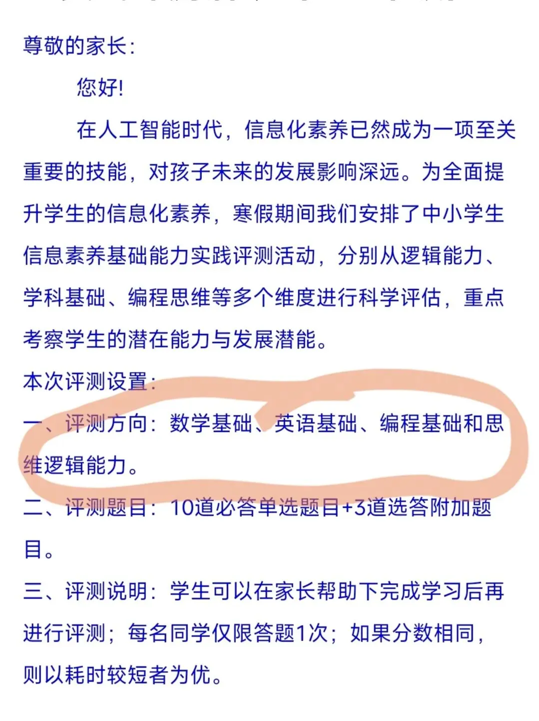 公告:为了开展好2026年3月份的全市中小学生信息素养普查测试,烦请各位老师将链接下发给各相关班级,学生们可以在寒假期间参加中小学生信息素养基础能力实践评测活动。内容包括公益课及评测。谢谢大家![Shake]