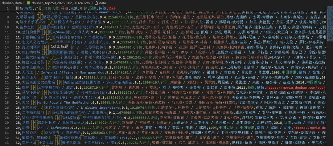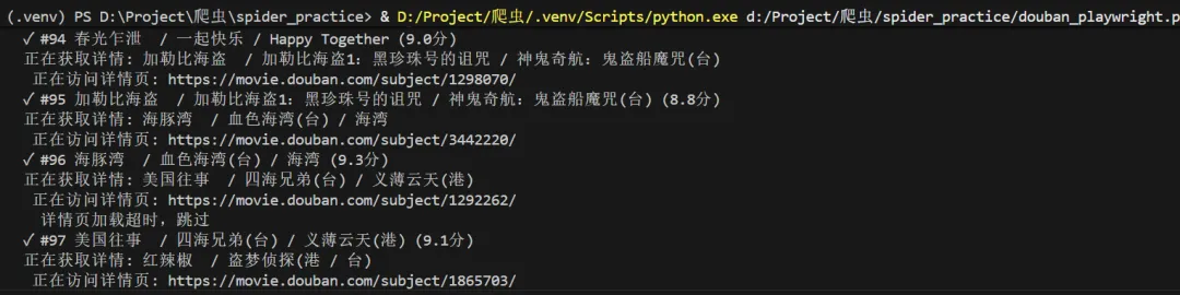 import asyncioimport csvimport jsonimport osimport sysfrom dataclasses import dataclass, asdictfrom datetime import datetimefrom typing importListfrom playwright.async_api import async_playwrightimport re@dataclassclassMovie: rank: int title: str rating: float rating_count: str directors: str actors: str year: str country: str tags: str link: strclassConfig:"""配置文件"""# 自定义浏览器路径(设为None则使用默认) CHROME_PATH = r'C:\Program Files (x86)\Google\Chrome\Application\chrome.exe'# 你的路径# CHROME_PATH = None # 使用Playwright自带的Chromium# 代理设置(如果需要) PROXY = None# 例如: {'server': 'http://127.0.0.1:1080'}# 请求间隔(秒) REQUEST_DELAY = 1# 输出目录 OUTPUT_DIR = 'douban_data'classDoubanScraper:def__init__(self, config: Config):self.config = configself.movies: List[Movie] = []# 确保输出目录存在 os.makedirs(config.OUTPUT_DIR, exist_ok=True)asyncdefcreate_browser(self):"""创建浏览器实例,支持自定义路径""" p = await async_playwright().start() launch_options = {'headless': False, # 显示浏览器界面'slow_mo': 100, # 减慢操作速度,便于观察'args': ['--disable-blink-features=AutomationControlled','--start-maximized','--disable-notifications', ] }# 添加代理(如果配置了)ifself.config.PROXY: launch_options['proxy'] = self.config.PROXY# 如果指定了Chrome路径,使用系统Chromeifself.config.CHROME_PATH and os.path.exists(self.config.CHROME_PATH):print(f"使用自定义Chrome: {self.config.CHROME_PATH}") launch_options['executable_path'] = self.config.CHROME_PATH launch_options['channel'] = 'chrome'else:print("使用Playwright自带Chromium")# 检查是否安装了Chromiumifnotself._check_chromium_installed():print("正在安装Chromium...") os.system(f'{sys.executable} -m playwright install chromium')try: browser = await p.chromium.launch(**launch_options)return p, browserexcept Exception as e:print(f"启动浏览器失败: {e}")# 尝试无头模式 launch_options['headless'] = True browser = await p.chromium.launch(**launch_options)return p, browserdef_check_chromium_installed(self):"""检查Chromium是否已安装"""from playwright._impl._driver import get_driver_envimport jsontry:# 获取浏览器信息 env = get_driver_env() browsers_file = os.path.join(env["PLAYWRIGHT_BROWSERS_PATH"], ".browsers.json")if os.path.exists(browsers_file):withopen(browsers_file, 'r') as f: browsers = json.load(f)returnany(b['name'] == 'chromium'for b in browsers['browsers'])except:passreturnFalseasyncdefscrape_movie_details(self, page, movie_link: str) -> dict:"""爬取电影详情页信息 - 修复版""" details = {'directors': '','actors': '','year': '','country': '','tags': '', # 修改为tags,与Movie类字段名一致'duration': '' }try:# 创建新页面访问详情 context = page.context detail_page = await context.new_page()print(f" 正在访问详情页: {movie_link}")await detail_page.goto(movie_link, wait_until='domcontentloaded')# 等待基本信息区域加载try:await detail_page.wait_for_selector('#info', timeout=10000)except:print(" 详情页加载超时,跳过")await detail_page.close()return details# 获取整个信息区域的文本 info_text = await detail_page.locator('#info').text_content() info_text = info_text.strip() if info_text else""# 提取导演信息try:# 方法1:使用更精确的选择器 director_elements = await detail_page.query_selector_all('#info span:has-text("导演") ~ span a')if director_elements: directors = []for elem in director_elements[:3]: # 最多取3个导演 name = await elem.text_content()if name: directors.append(name.strip()) details['directors'] = ' / '.join(directors)else:# 如果上面的方法没找到,尝试另一种方式 director_element = await detail_page.query_selector('#info span:has-text("导演")')if director_element: director_value_span = await director_element.query_selector('..')if director_value_span:# 获取下一个兄弟节点中的span next_span = await director_value_span.query_selector('following-sibling::span[1]')if next_span: director_text = await next_span.text_content() directors = director_text.split('/') details['directors'] = ' / '.join([d.strip() for d in directors[:3]])except Exception as e:print(f" 提取导演失败: {e}")# 提取演员信息(前5位)try:# 查找演员区域 actor_elements = await detail_page.query_selector_all('#info span:has-text("主演") ~ span a')if actor_elements: actors = []for actor_elem in actor_elements[:5]: # 最多取5个演员 actor_name = await actor_elem.text_content()if actor_name: actors.append(actor_name.strip()) details['actors'] = ' / '.join(actors)else:# 如果上面的方法没找到,尝试另一种方式 actor_element = await detail_page.query_selector('#info span:has-text("主演")')if actor_element: actor_value_span = await actor_element.query_selector('..')if actor_value_span:# 获取下一个兄弟节点中的span next_span = await actor_value_span.query_selector('following-sibling::span[1]')if next_span: actor_text = await next_span.text_content() actors = actor_text.split('/') details['actors'] = ' / '.join([a.strip() for a in actors[:5]])except Exception as e:print(f" 提取演员失败: {e}")# 提取年份(使用正则表达式)try: year_match = re.search(r'(\d{4})', info_text)if year_match: details['year'] = year_match.group(1)except Exception as e:print(f" 提取年份失败: {e}")# 提取国家/地区try:if'制片国家/地区:'in info_text: country_part = info_text.split('制片国家/地区:')[1]# 取第一个换行符之前的内容 country_text = country_part.split('\n')[0].strip() details['country'] = country_textexcept Exception as e:print(f" 提取国家失败: {e}")# 提取类型/标签(tags字段)try:# 方法1:使用属性选择器 genre_elements = await detail_page.query_selector_all('#info span[property="v:genre"]')if genre_elements: genres = []for elem in genre_elements: genre = await elem.text_content()if genre: genres.append(genre.strip()) details['tags'] = ' / '.