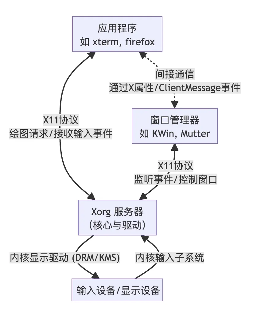 X.Org 项目提供了 X 窗口系统的开源实现。开发工作是在 freedesktop.org 社区的通力合作下完成。X.Org 组织是非盈利教育机构,其董事会为这项工作服务,其成员领导这项工作。Xorg (通常简称为 X)在 Linux 用户中非常流行,已经成为图形用户程序的必备条件,所以大部分发行版都提供了它。详情参见 Xorg 维基文章或访问Xorg 网站。客户端-服务器分离是X11架构的基石。所有你看到的图形界面,都由运行在远端的“客户端”程序生成,通过协议发送给本地的“服务器”来呈现。- X Server:唯一直接与硬件(显卡、显示器、键盘、鼠标、触摸板)对话的组件。