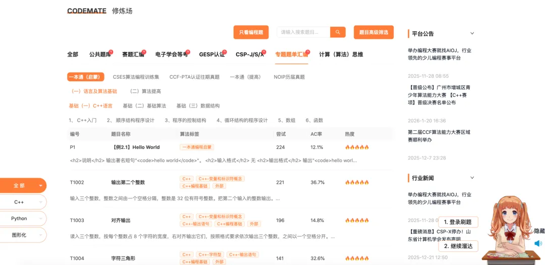 在产品层面,AIOJ 呈现出一种明显不同于多数竞品的形态:题库体系完整、覆盖面极广,看起来「多而全」。这种设计并非偶然,而是一种高度自觉的阶段性选择。