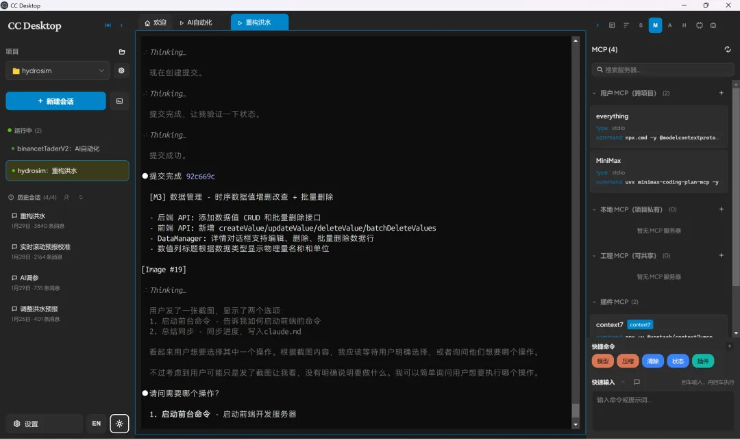 2026年2月2日,智水工坊决定把内部使用的 AI编程可视化工具向伙伴们开源!多窗口tab切换/会话重命名/API模型切换/命令队列/历史发送记录/提示词复用/Skill管理/MCP配置/Agent管理/插件管理/Hook定义/AI助手地址:https://github.com/hydroCoderClaud/cc-desktop缘起:Claude Code好用,但CLI界面的友好度对于不太习惯黑乎乎的窗口的coders来说,有很多隐藏的能力,难以使用。同时,只有一个输入命令行,遇到多个需求list,很多伙伴都是打开记事本写需求,然后复制过来,极其不变。工程会话恢复时记不起来是哪一个会话,会话历史查询不方便等等,诸多效率工具缺乏。Skills、MCP、Agents、插件无法异步查看,模型思考和输出时,运行/命令需要等待,等待期间输入容易卡死等。因此我们开源自己使用的CC Desktop,凡是使用Claude Code编程的人员无门槛上手即用。欢迎大家star,fork,共同优化。目前帮助文档优化中,请自行摸索先。需要帮助,可扫码入群,结识AI编程朋友,共享技术进步。