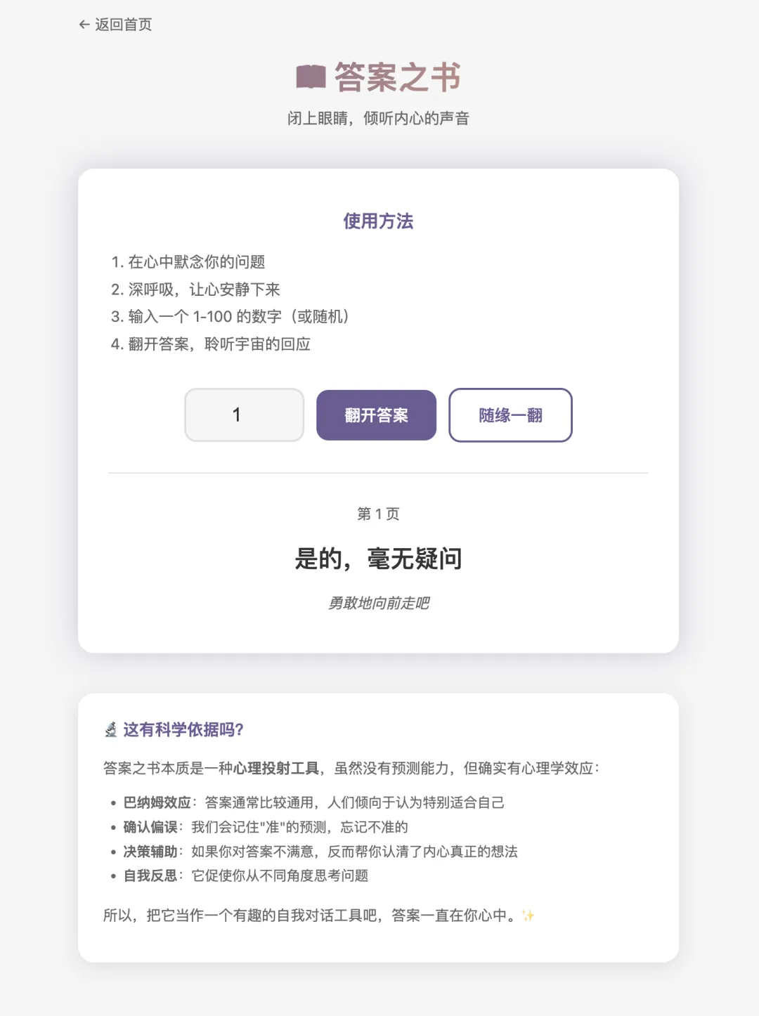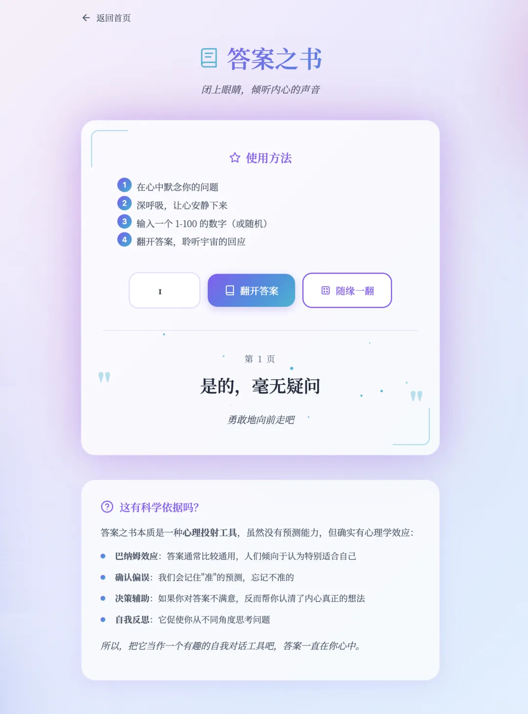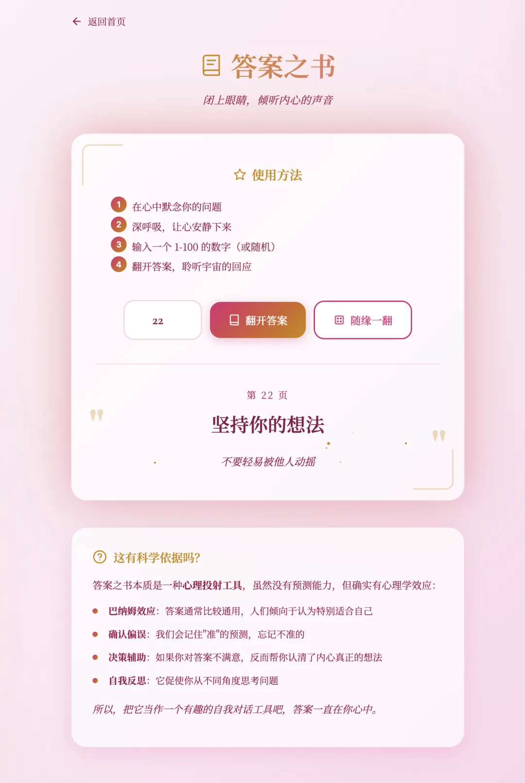 为了尝试 Claude Code + Skills(打算试试目前有名的https://github.com/nextlevelbuilder/ui-ux-pro-max-skill),做了答案之书应用。