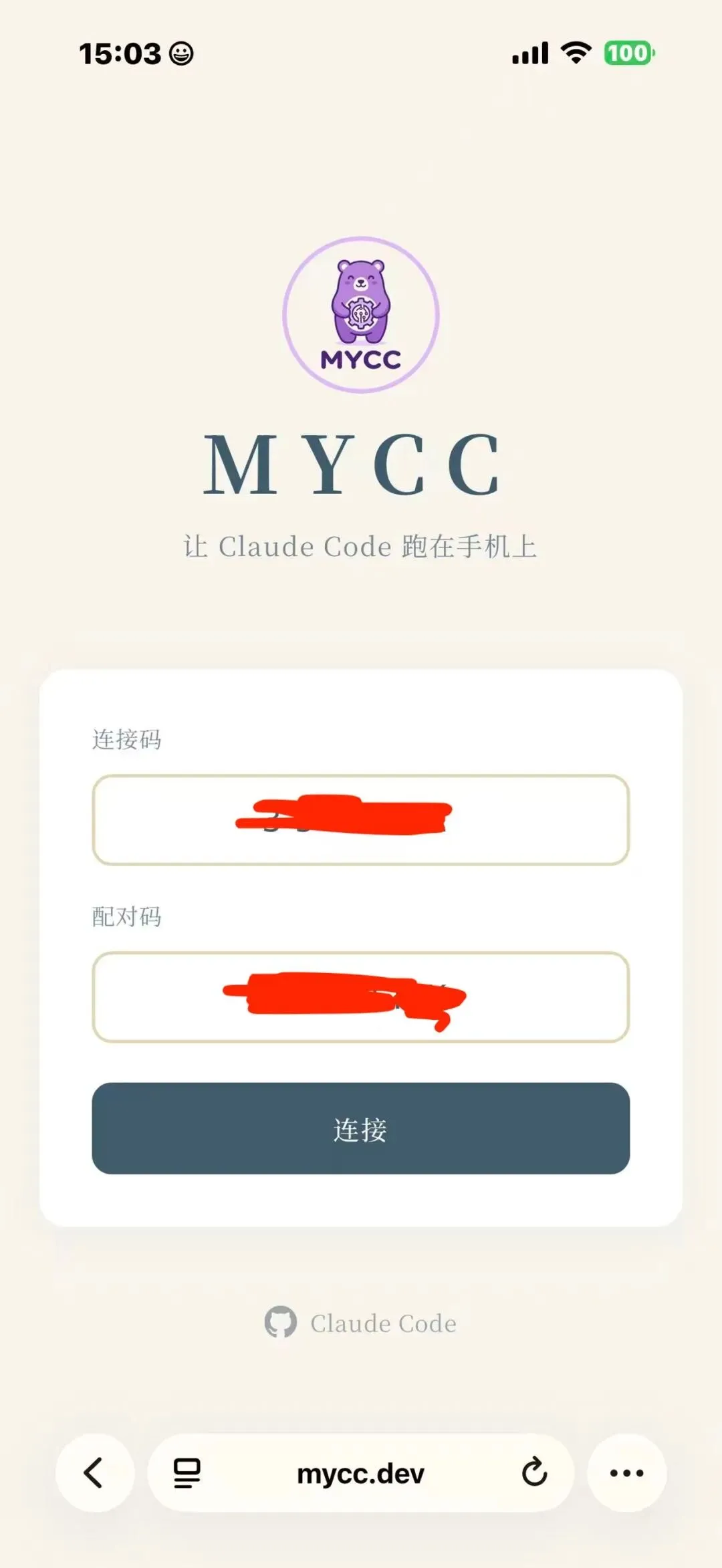 然后你手机需要进入一个地址https://mycc.dev ,按cc告诉你的连接码和配对码来配对就能进入页面啦。