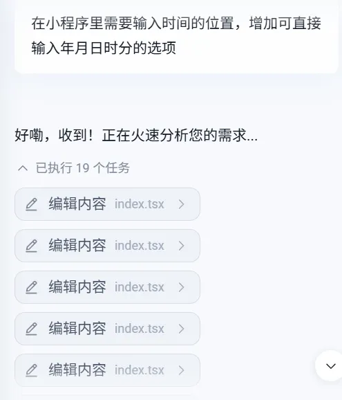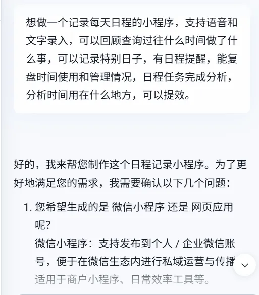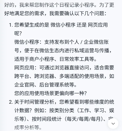 打开秒哒,说我想做个时间管理小程序,接到指令,秒哒就开始认真工作啦……