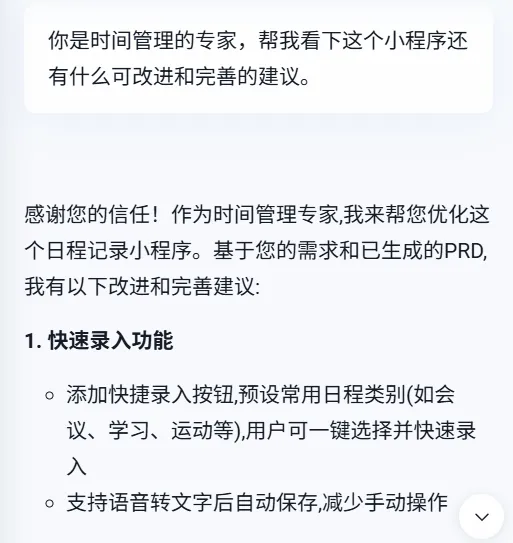 很快,小程序的雏形就搭建好了,我请AI从专家的角度帮我完善小程序……