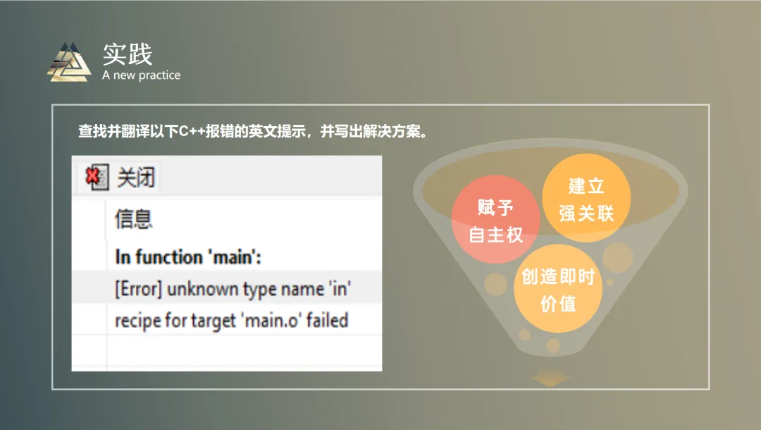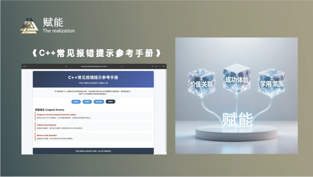 于是我又学习来更多的专业知识做学科交叉,给孩子们做了一个中英对照的《C++常见报错提示参考手册》,让生硬的代码符号化作温润路标,引他们在逻辑的森林里安心探秘。 从这份特殊的翻译作业里,我提炼出了一个可复制的赋能公式:赋能,就是为学生建立清晰的价值关联,设计微小的成功体验,并营造一个学以致用的氛围。