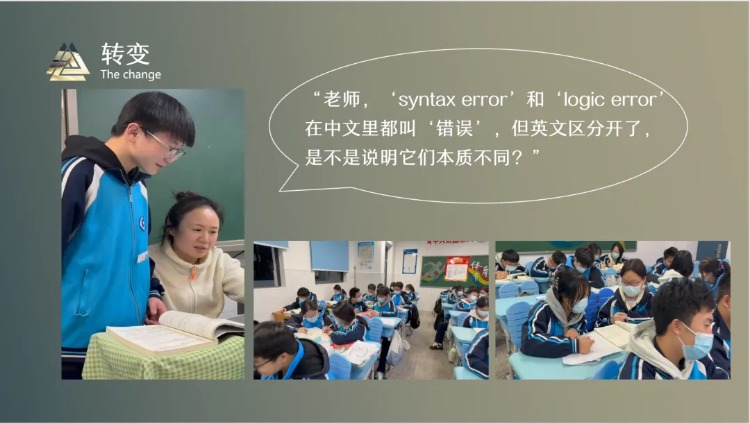 最让我触动的是,课后一个学生跑来问我:‘老师,‘syntax error’和‘logic error’在中文里都叫‘错误’,但英文区分开了,是不是说明它们本质不同?’ 那一刻我知道,学习,已经从一种被动的负担,变成了一场主动的探索。