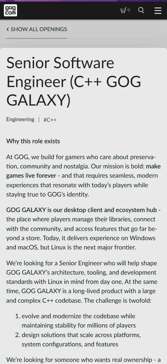 GOG最近的动作之所以引发关注,并不仅仅因为它“也要做Linux客户端”,而是它在招聘信息中给出的定位极为明确:Linux 被描述为“The next major frontier(下一块主要前沿)”。岗位职责强调从架构、工具链、开发标准层面出发,从第一天起就以Linux为目标设计,并直面Galaxy客户端多年累积的复杂C++代码问题。