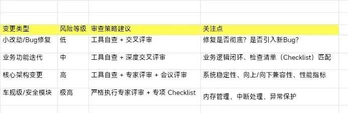 如果每个模块不管是新建还是维护都走全量评审,研发效率又会受到损伤。 每行代码都经历同样的审查流程不太现实,最好采取“因地制宜、按需分级”的策略。