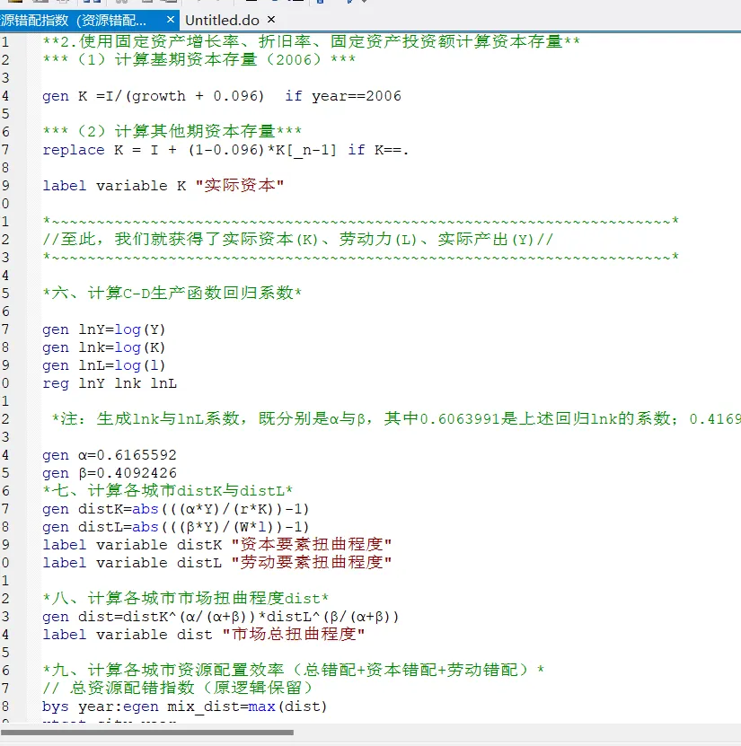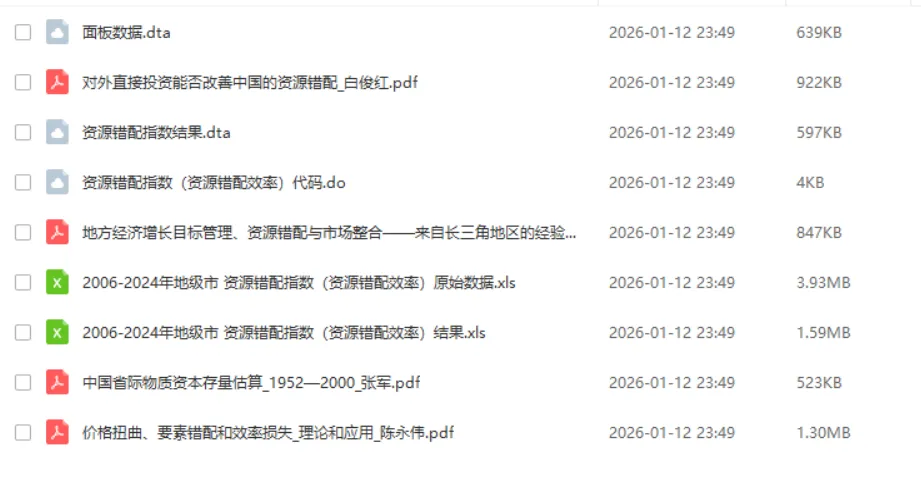 地级市资源错配指数(资本/劳动)(2006-2024年)- 原始数据.dta、计算代码.do、PDF教程+参考文献- 资源错配指数/程度/效率- 资本要素扭曲程度- 劳动要素扭曲程度- 市场总扭曲程度- 资源错配指数/程度/效率二、数据内容- 280地级市,5320个样本,平衡面板数据- 熵值法、matlab效率测度等方法,计算结果符合CSSCI等核心期刊规范,已通过显著性检验,可直接作为核心解释变量- 附原始数据、计算代码、复现代码、参考文献- 数据来源:《中国城市统计年鉴》、国家统计局、EPS数据库,部分缺失值用线性插值法补充,最终形成5320个有效研究样本三、指标体系- y_index:GDP指数- l:劳动要素- r:资本要素- w:劳动要素价格指数- i:资本要素价格指数- 资本要素扭曲程度- 劳动要素扭曲程度- 市场总扭曲程度- 资源错配指数/程度/效率【参考文献】高山,夏帅,陈阳,等.地方经济增长目标管理、资源错配与市场整合——来自长三角地区的经验证据.云南财经大学学报,2024,40(03):1-20.白俊红,刘宇英.对外直接投资能否改善中国的资源错配.中国工业经济,2018,(01):60-78.陈永伟,胡伟民.价格扭曲、要素错配和效率损失:理论和应用.经济学(季刊),2011,10(04):1401-1422价格说明:由于搜集整理耗费时间较长,数据价格及详情添加下方客服详询。