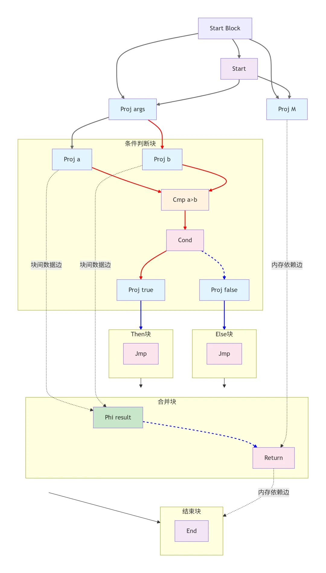 Proj M 到 Return 的内存状态传递(蓝色实线) - 4. Phi 节点:在控制流汇合点合并来自不同路径的值,这是 SSA 形式的核心