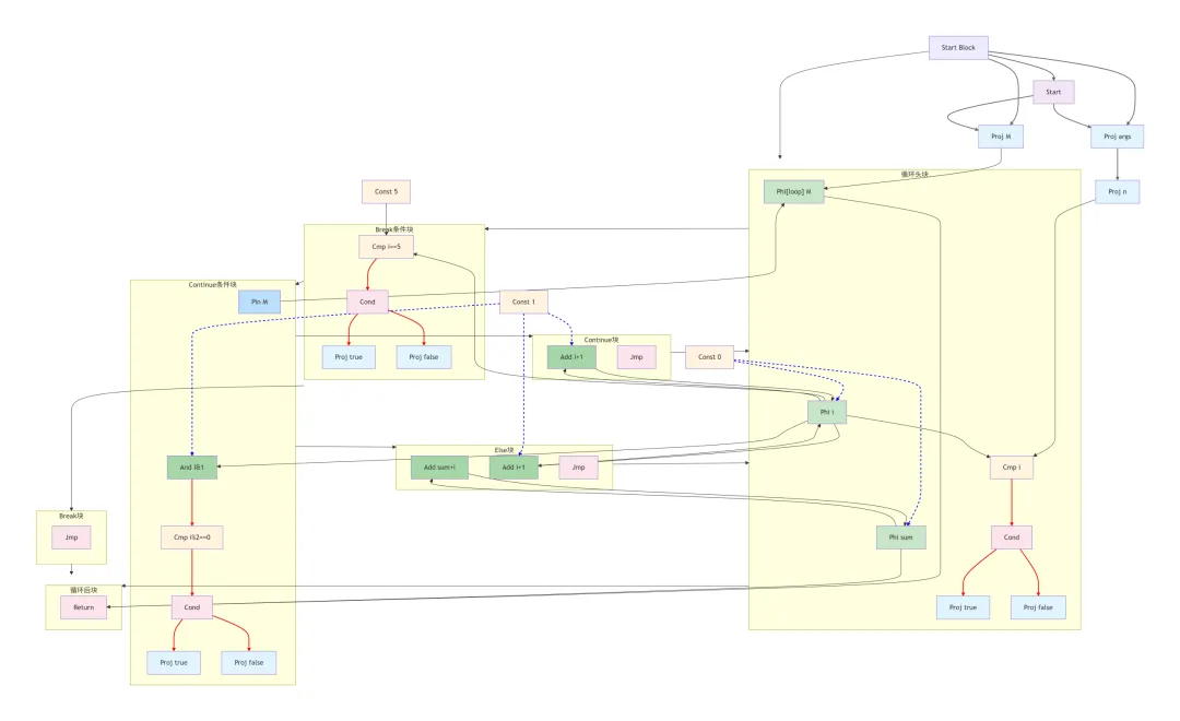 Proj true/false)指向基本块(红色实线) - 2. 跨块数据边:从源节点的数据输出到目标节点的数据输入(蓝色虚线)