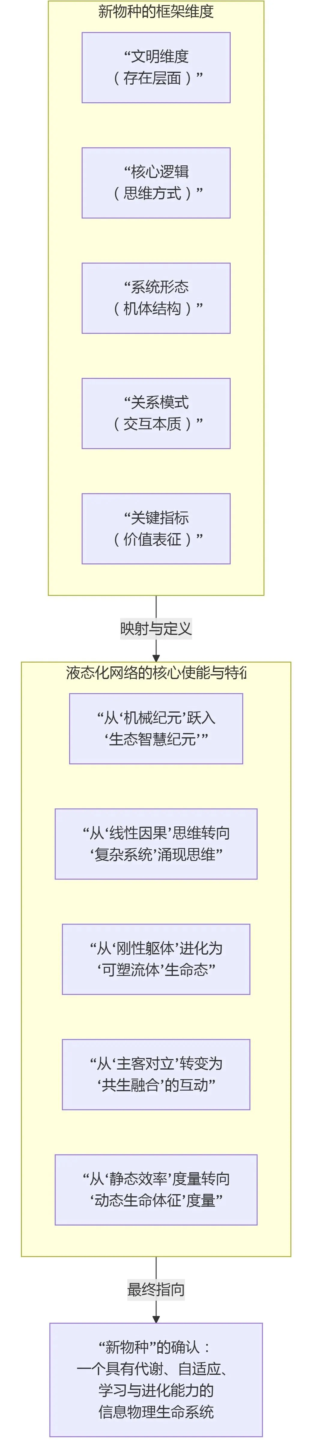 下图从"新物种"框架的五大核心维度,解析液态化网络如何定义其生命属性: