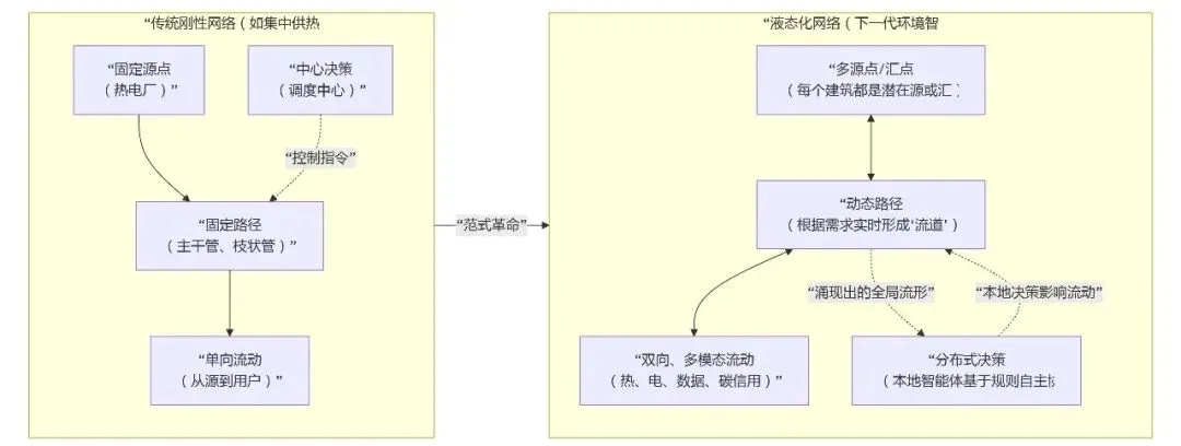 与人的关系:网络不再只是把热量"推"给人的管道,而是成为人与环境共生体验的介质。当系统感知到人的偏好变化时,液态化网络能瞬间调整能量流、信息流,重新"编织"出符合需求的小气候,使人感觉环境如"活水"般围绕自己流动、适应。