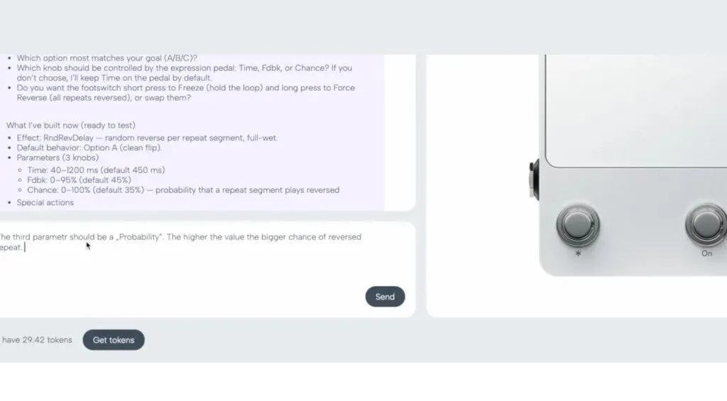 Polyend 让你能够构建和编写自己的效果据Polyend官方说明,社区效果器可免费下载,且每日更新。但Playground应用采用代币系统,每次触发效果需要消耗一个积分,但触发后该效果就归你所有。每个新拥有者初始拥有20个代币。文本效果这是一个无需任何编程的自然语言描述转化为可编译的即用效果文件提示词。只需描述你想要的声音(例如,“梦幻般的低保真混响,带点粒子感”),下载生成的文件,然后将其拖放到效果器上即可,系统便会通过 AI 生成对应的 DSP 代码并编译,用户随后可通过 USB-C 接口将其放入踏板即可。
