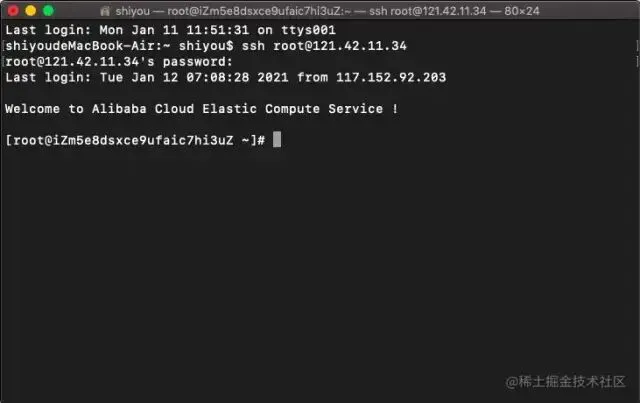 ssh root@121.42.11.34命令,然后输入服务器连接密码就可以顺利登录远程服务器。从现在开始我们就可以在本地电脑操作远程服务器。