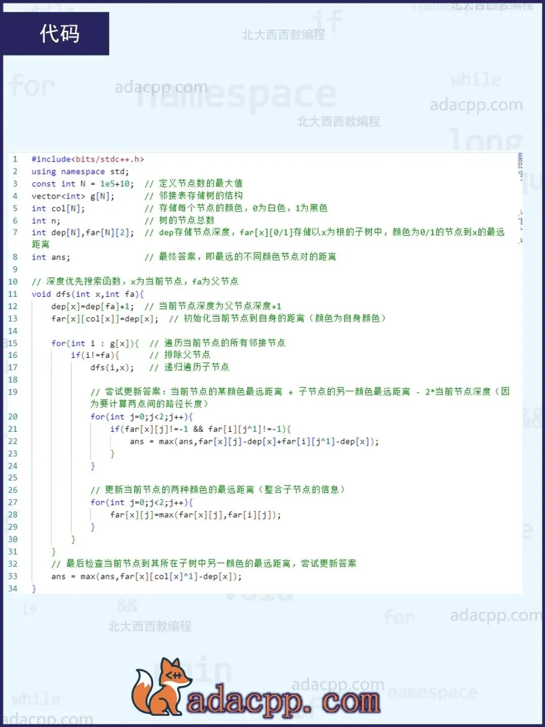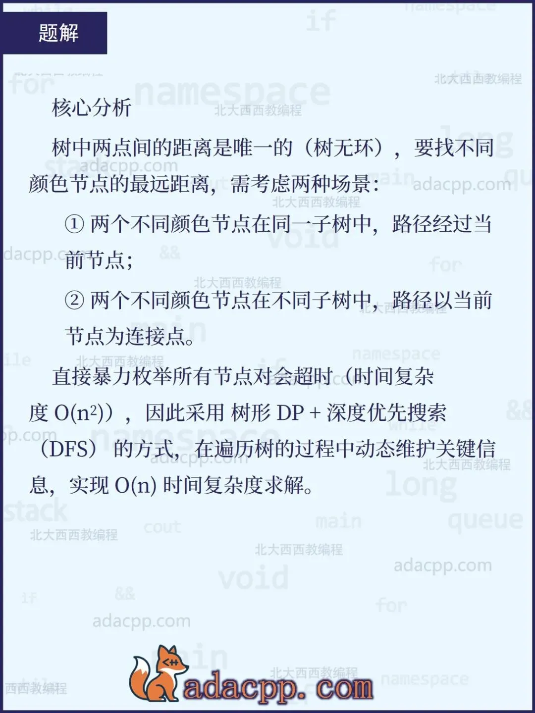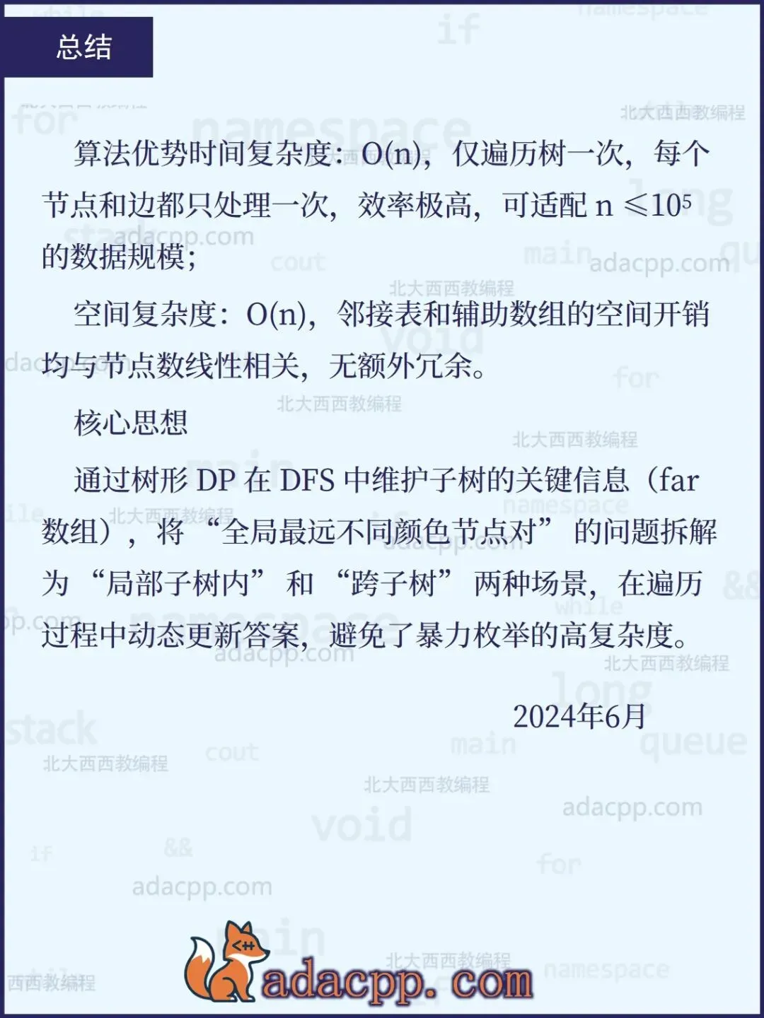 关键在于树形DP+DFS的组合拳,用far数组维护子树关键信息,把“全局最远不同颜色节点对”这个复杂问题,拆解成两种可处理的局部场景: