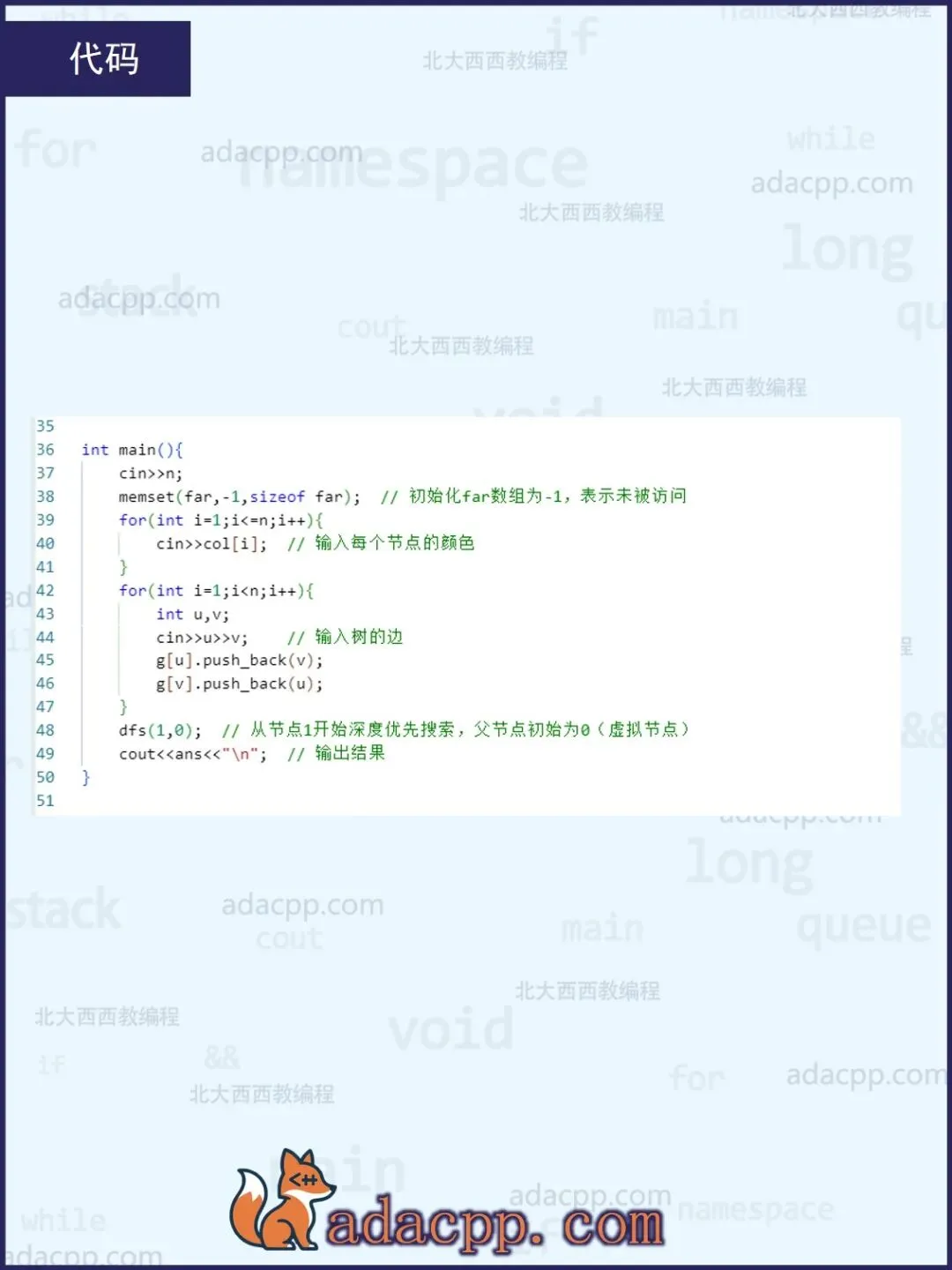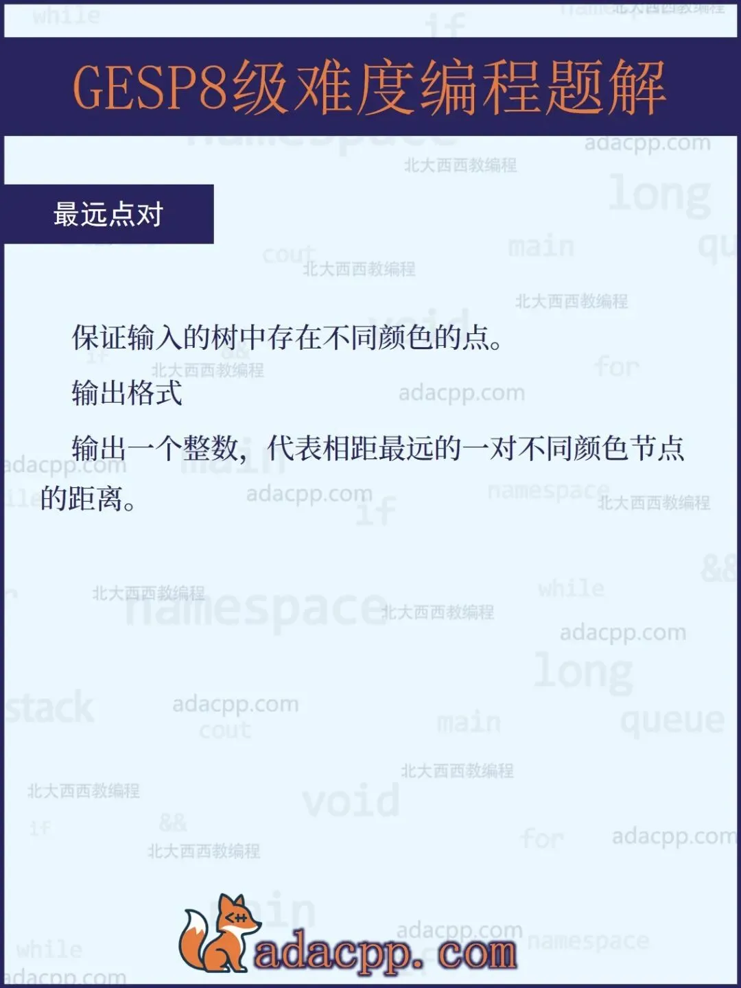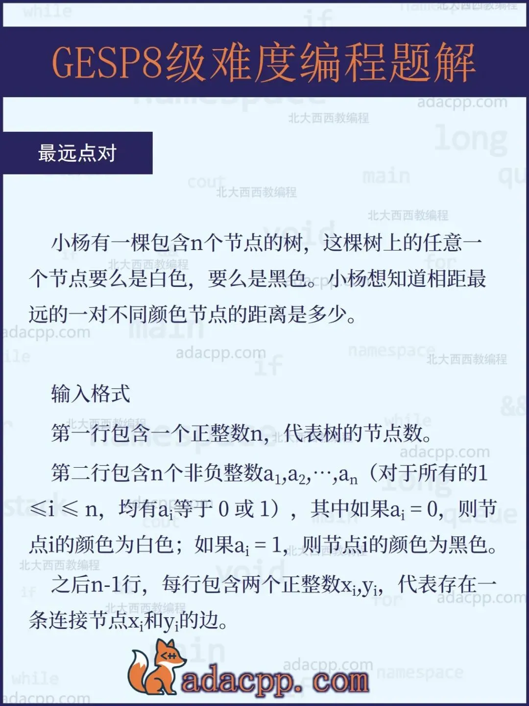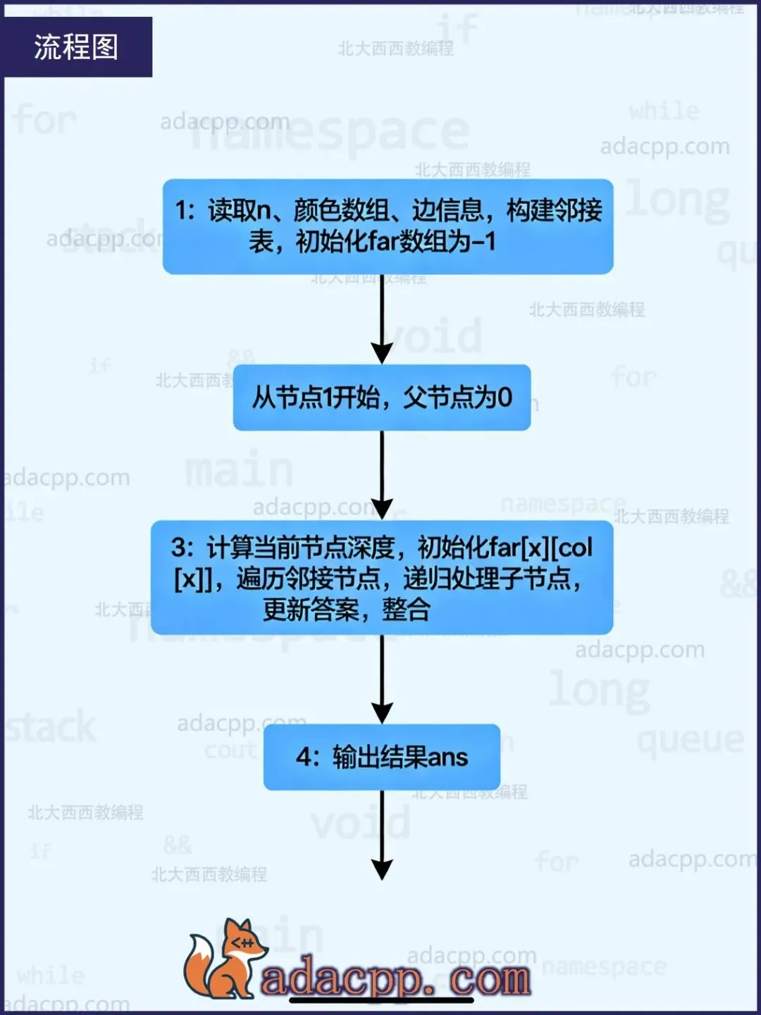 关键在于树形DP+DFS的组合拳,用far数组维护子树关键信息,把“全局最远不同颜色节点对”这个复杂问题,拆解成两种可处理的局部场景: